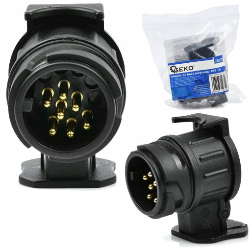 Adapter umożliwia podłączenie przyczepy z wtyczką 7 pinową (polskiej) do gniazda 13 wtykowego (niemieckiego).