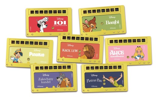 W przegrodzie z tyłu rzutnika znajdziesz 8 kart: kołysanki i 7 ulubionych bajek Disney'a: Bambi, Pinokio, Piotruś Pan, Zakochany kundel, Alicja w Krainie Czarów, 101 dalmatyńczyków i Król Lew.