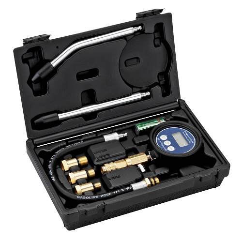 Zastosowanie: Zmniejszanie ciśnienia w komorze spalania w silniku benzynowym. Może wyświetlać odczyty w barach 0-21 PSI 0-30 i KPA 0-2068 dzięki 2,5 "LCD cyfrowemu miernikowi z zaworem bocznym do szybkiego ponownego badania i szybkozłączem i wyświetlaczem z wieloma jednostkami ciśnienia. Możliwość przechowywania sześciu odczytów kompresji. Zawartość: 1) Elastyczny wąż (300 mm) z obciążeniem sprężyny szybkiego połączenia i podwójnym adapterem M14 / M18. 2) Proste i kątowe gumowe elementy ciśnieniowe. 3) Adaptery na różne wielkości gwintów świec zapłonowych: M10x1.0m, M12x1.25m, M14x1.25m. 4) Asortyment o-rings. 5) Bateria 9V 6LR61. Ciśnienie w PSI: 0-304 psi.