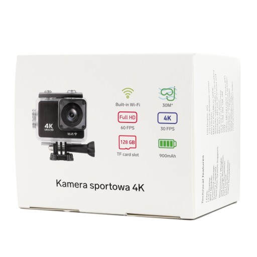 Kamera umożliwia nagrywanie w jakości 4K z prędkością 30 klatek na sekundę. Kiedy założysz dołączoną obudowę, możesz zanurzyć kamerę do 30 metrów głębokości. Pojemny akumulator pozwala nagrywać filmy aż przez 29 minut. Dodatkowo kamera robi zdjęcia o rozdzielczości 4608 x 3456 px.