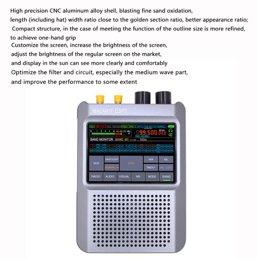 1. Wysoka czułość i funkcjonalność NR: Malahit-DSP2 wyróżnia się w wykrywaniu słabych sygnałów i znacząco poprawia jasność odsłuchu dzięki unikalnej funkcji redukcji szumów NR, co zapewnia doskonałe doświadczenie odsłuchu.