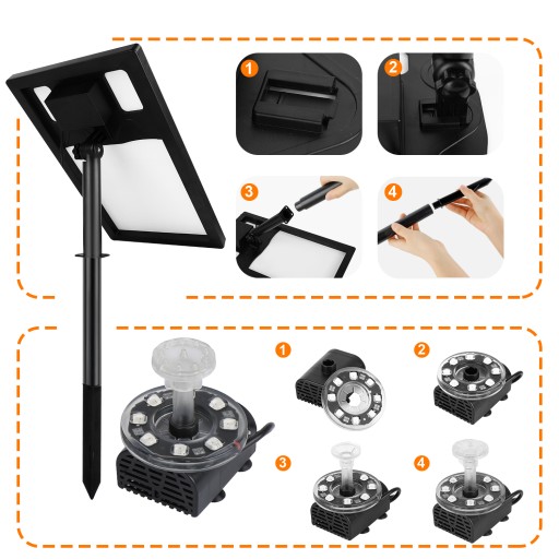 Ta pompa słoneczna co jest idealne dla kąpieli ptaków, akwariów, małych stawów, basenów, ogrodów, cyrkulacji wody tlenowej. Twój ogród z pewnością przyciągnie uwagę przechodniów. Nadaj swojemu ogrodowi wesołą dekorację dzięki solarnej pompie wodnej.