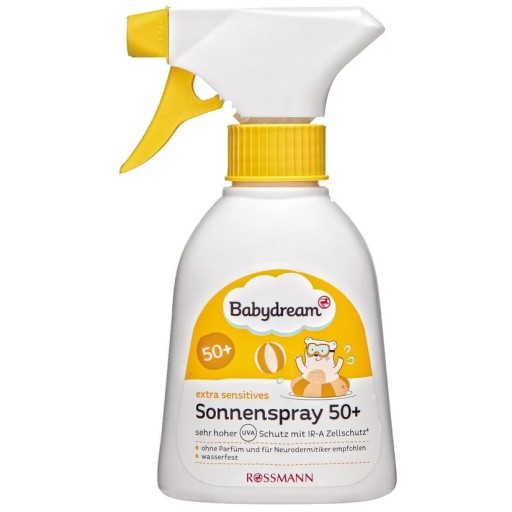 Dla szczególnie wrażliwej na słońce, nie opalonej skóry dzieci: wodoodporny * Babydream SPF 50+ zapewnia natychmiastową i niezawodną ochronę przed oparzeniami słonecznymi. Jest odpowiedni dla osób cierpiących na neurodermit. Posiada szerokopasmowy system filtrów UVA + UVB z witaminą E, a także ochronę przed IR-A **. Ponadto ma długotrwały wpływ na wysuszenie skóry i sprawia, że skóra jest gładka. * Niezależny instytut testowy potwierdza, że po 40 minutach w wodzie jest jeszcze co najmniej 50% współczynnika ochrony przeciwsłonecznej. ** Przy regularnym stosowaniu preparat pomaga komórkom skóry chronić się przed aktywacją enzymów degradujących kolagen przez promieniowanie podczerwone A, a tym samym zapobiega dalszym przedwczesnym zmarszczkom wywołanym przez słońce.