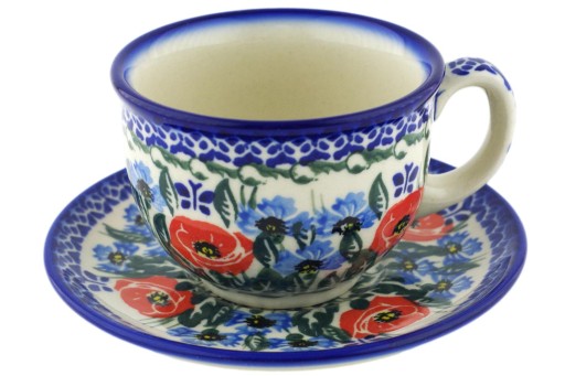 Ręcznie zdobiona filiżanka z spodkiem wytwarzana przy użyciu tradycyjnej bolesławieckiej metody zdobienia stemplami oraz pędzlami.