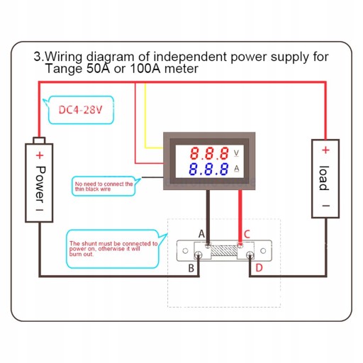 4. PARAMETRY TECHNICZNE: Monitor napięcia amperażu, zakres pomiaru napięcia od 0,0 V do 100 V, obsługa zakresu pomiaru prądu 0-10 A, 0-50 A, 0-100 A (dostępne są 3 zakresy)