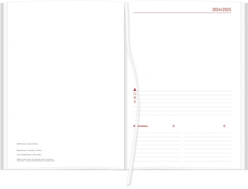 - kalendarium od 01.07.2024 do 24.08.2025 (lipiec i sierpień w układzie 2 tygodnie na 1 stronie, pozostałe miesiące w układzie tygodniowym - 1 tydzień na 2 sąsiednich stronach)