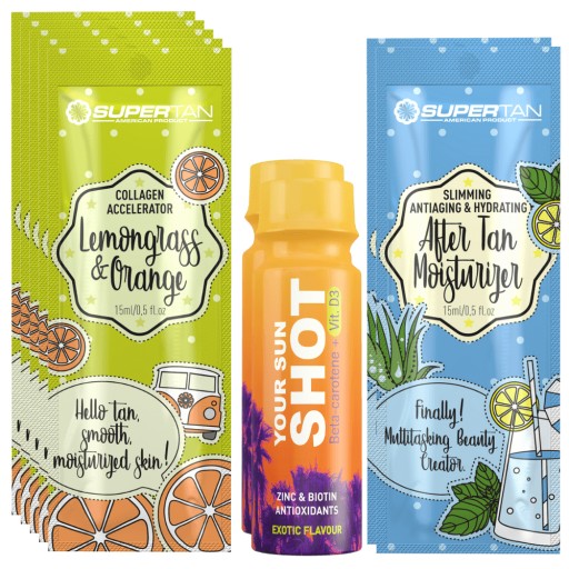 Zestaw do opalania w solarium: 5x saszetki 15ml LEMONGRASS & ORANGE przyspieszacz opalania plus GRATISY