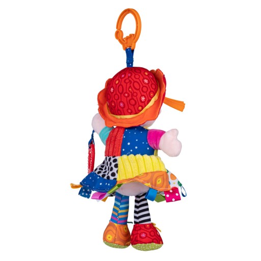 Laleczka w formie zawieszki sprawdzi się idealnie zarówno podczas domowej zabawy, jak i na spacerze w wózku. Nicole ubrana jest w sukieneczkę z kolorowych łatek, wykończoną materiałowymi metkami. Zróżnicowane faktury materiałów, z których została uszyta, stymulują zmysł wzroku i dotyku malucha, wspierając tym samym rozwój jego zdolności poznawczych. Lala posiada przy rączce gryzak z wypustkami, a w brzuszku, ukryty dzwoneczek, który przy potrząsaniu zabawką, wydaje wesoły dźwięk. Praktyczny uchwyt ułatwi przymocowanie zawieszki w dowolnym miejscu.