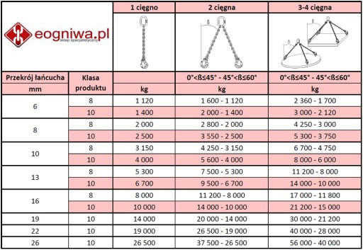 Udźwig WLL przy kącie 0°-45° – 1600 kg; przy kącie 45°-60° – 1120 kg