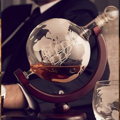 Kafarka do whisky w kształcie globusa ze szklaną żaglówką wykonana jest z wysokiej jakości materiału, w zestawie z drewnianą podstawką oraz dwoma szklankami