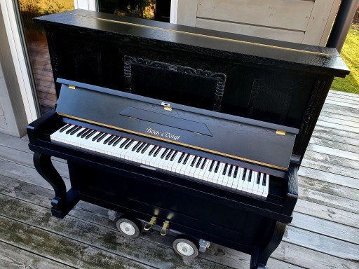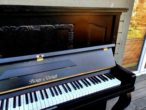 Pianino wyprodukowane przez niemiecką fabrykę Bogs & Voigt z Berlina. Jest to wysokie, koncertowe pianino w dużej, ładnej obudowie z elementami ozdobnymi. Instrument jest wysoki az na 133,5cm, to znaczy ma wielkość koncertową - duża płyta rezonansowa i długie struny basowe zapewniają bardzo wyraziste i głębokie brzmienie. Jednocześnie posiada w pełni współczesną konstrukcję, tj. mechanikę dolnotłumikową która precyzyjnie oddaje zamiary pianisty i dobrze tłumi, pełną żeliwną ramę dobrze usztywniającą całą konstrukcję i struny w układzie krzyżowym pozytywnie wpływające na brzmienie zwłaszcza basów. Obudowa pianina została gruntownie odrestaurowana wraz z położeniemo nowego czarnego, matowego lakieru. Na powierzchni zachowany pięknie prezentujący się wzór słojów drewna. Pianino wygląda z zewnątrz jak nowe. Wnętrze instrumentu zostało poddane remontowi kapitalnemu, z szerokim zakresem wymian podzespołów. W pianinie założono nowy komplet młotków, nowe tłumiki, nowe struny, nowe kołki stroikowe, nowe filce klawiatury, co zagwarantuje pełną sprawność techniczną instrumentu i dźwiękową instrumentu na kilkadziesiąt następnych lat grania. Wykonane zotały wszystkie niezbędne do prawidłowego działania instrumentu naprawy i wymiany. Pianino jest wyregulowane, nastrojone i gotowe do grania.