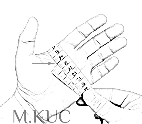 Rękawiczki produkujemy w 5 rozmiarach męskich i 4 damskich. Aby ustalić twój rozmiar musisz zmierzyć obwód dłoni jak na załączonym obrazku. Zrób to dość ścisle ale nie ściskaj dłoni metrem. Co 1 cm obwodu jest kolejny rozmiar. Jeżeli jesteś w połowie pomiędzy rozmiarami to zaokrąglaj w dół jeżeli wolisz bardziej dopasowane rękawiczki lub w górę jeżeli preferujesz luźniejsze dopasowanie. Czyli mając wynik 21,5cm zaokrąglij do rozmiaru 21 lub 22 w zależności od preferencji.Rozmiary damskie: