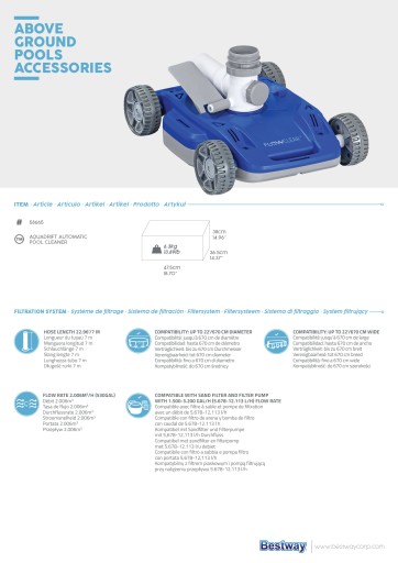 Półautomatyczny odkurzacz basenowy Bestway Flowclear AquaDrift jest świetny ze względu na swoją prostą obsługę. Odkurzacz działa tylko wtedy, gdy jest podłączony do pompy filtrującej, która musi mieć minimalny przepływ filtra wynoszący 5678 litrów na godzinę. Wydajność czyszczenia zależy od wydajności filtracji, im wyższa wydajność filtracji, tym skuteczniejsze będzie odkurzanie, ale zalecany jest maksymalny przepływ filtracji wynoszący 12113 litrów na godzinę. Odkurzacz przeznaczony jest do basenów naziemnych z kwadratowym lub okrągłym dnem. Wystarczy go podłączyć, włączyć, a odkurzacz sam się wszystkim zajmie. Produkty firmy Bestway spełniają najsurowsze normy bezpieczeństwa dotyczące przetwarzania i stosowanych materiałów.