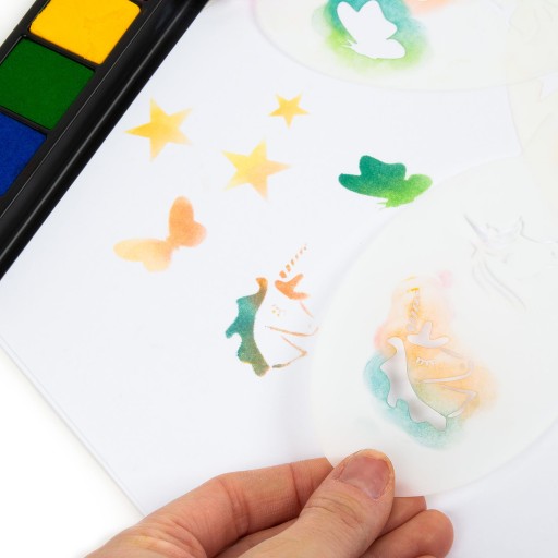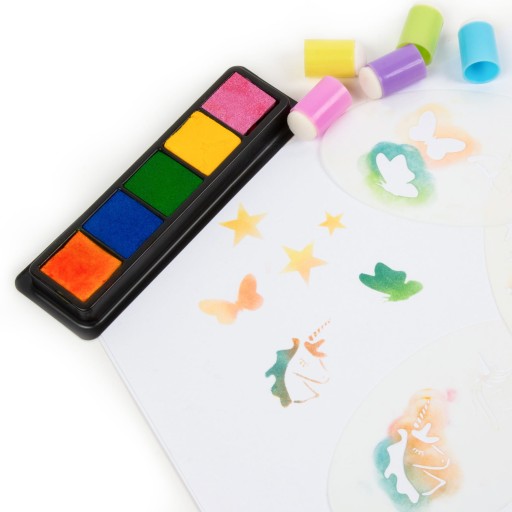 - Pięć kolorów atramentu: różowy, pomarańczowy, żółty, zielony i niebieski można mieszać i cieniować ze sobą za pomocą aplikatorów, tworząc jedyne w swoim rodzaju wielobarwne obrazki, w których kolory magicznie się przenikają.
