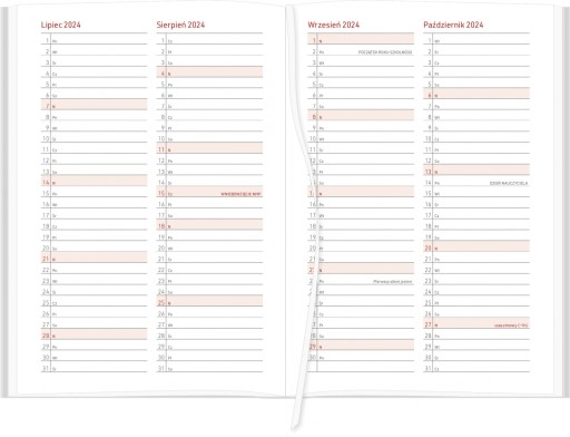 - planer na rok szkolny 2024/2025 (od lipca 2024 do października 2025) - kolejne miesiące roku szkolnego w kolumnach z miejscem na notatki przy każdym dniu