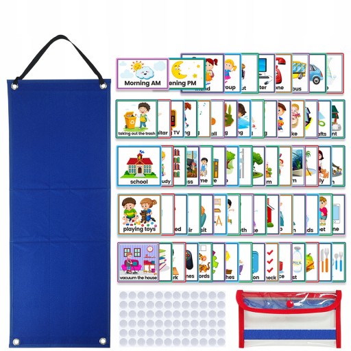 Wizualny harmonogram dla dzieci jest wykonany z powlekanego papieru, który jest wytrzymały, wodoodporny, niełatwy do rozerwania i odkształcenia, karty są dobrze wycięte i można je wielokrotnie mocować i usuwać za pomocą dołączonych naklejek w małe kropki Filcowe paski.