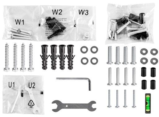 ✅W zestawie uniwersalny komplet śrub montażowych do telewizora oraz komplet wkrętów i kołków do ściany, poziomica