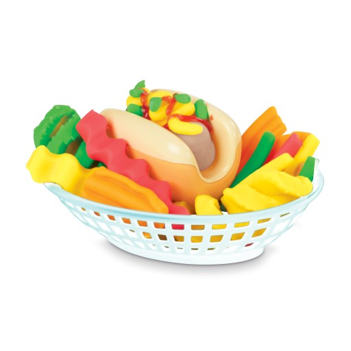 Zakręcone, karbowane, cieniutkie czy zupełnie płaskie - wszystkie frytki są mile widziane w świecie Play-Doh Kitchen Creations! Patrz, jak ciastolina kręci się, przechodząc przez transparentną maszynkę i tworzy szalone pokręcone, superdługie frytki! Wyciśnij proste frytki za pomocą "opakowania na wynos", karbowane wytnij specjalnym nożykiem, a za pomocą stempelka przygotuj płaskie "przypieczone" niby-ziemniaczki. Zapakuj je do koszyka, a potem przyozdób dodatkami i polej płynną masą Play-Doh Drizzle imitującą ketchup.