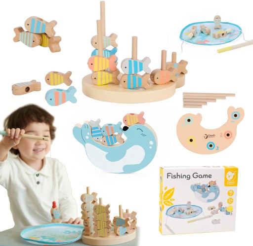 - złapane rybki możemy umieścić na drewnianych palikach, bądź po obróceniu na podstawce w kształcie wielorybka