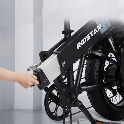 Ridstar H20 z podłączonym i przeciwwybuchowym wymiennym akumulatorem 48V/14 Ah. Akumulator litowo-jonowy roweru elektrycznego Ridstar jest wyposażony w różne funkcje, w tym wyłącznik przed przeładowaniem, przepięciem, przetężeniem i zwarciem. Po 1000 cyklach ładowania akumulator jest w stanie 80% własnej pojemności.