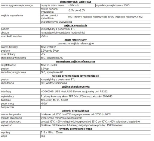 HDG6000B to seria nowoczesnych generatorów funkcyjnych produkcji Hantek. Generatory charakteryzują się dwoma niezależnymi analogowymi kanałami wyjściowymi, oraz 16 kanałami wyjściowymi. W zależności od modelu pasmo wyjściowe generowanych przebiegów wynosi od 60MHz do 200MHz. Rozdzielczość pionowa przetwornika wynosi 16bit (daje 216 = 65 536 poziomów kwantyzacji), próbkowanie w czasie rzeczywistym 1,25G sampli na sekundę. Generator wyposażony w szereg różnego rodzaju funkcji, przemiatania, modulacji itp. jak przystało na nowoczesny generator funkcyjny. Łatwa obsługa i duży wyświetlacz LCD typu TFT o przekątnej 7 cali i rozdzielczości 800x640.