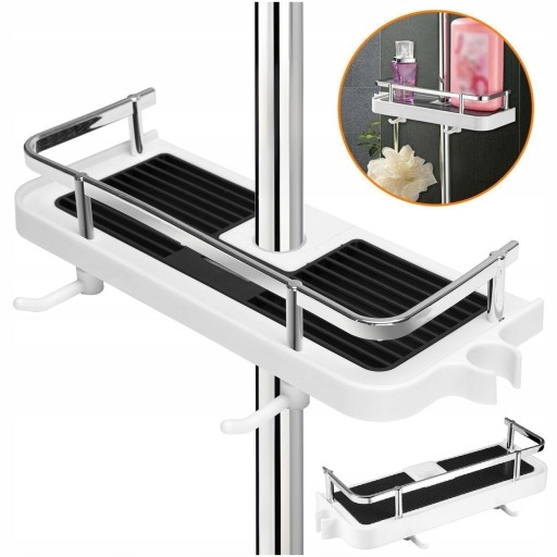 - Wygodna, kompaktowa półka do montażu na drążku prysznicowym.