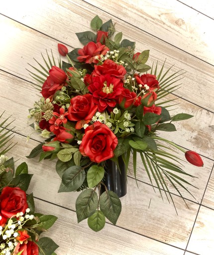 Przedmiotem sprzedaży jest efektowna wiązanka ze sztucznych, dobrej jakości kwiatów, w obciążonej misie w komplecie z wkładem do wazonu idealnie pasującego do głównego stroika.