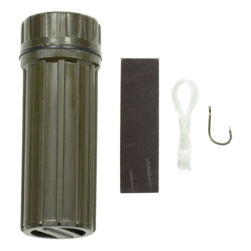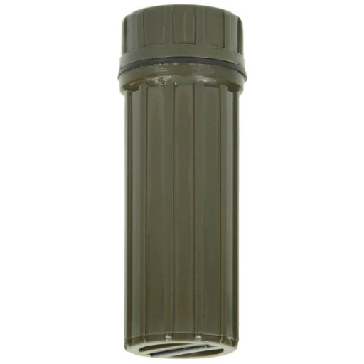 Pudełko na zapałki z zestawu przetrwania US Army. Produkt niemieckiej marki FOX Outdoor. Zestaw składa się z pudełka, kompletu do połowu ryb (żyłka i haczyk), krzesiwa, lusterka sygnałowego i draski do zapałek. Pudełko zostało wykonane z solidnego tworzywa ABS, odporne na uszkodzenia mechaniczne. Całkowicie wodoodporne, wyposażone w uszczelkę gumową. Kompaktowe wymiary i niska waga (mieści się w małej kieszeni dżinsów). Idealnie pasuje jako pojemnik na akumulator 18650.