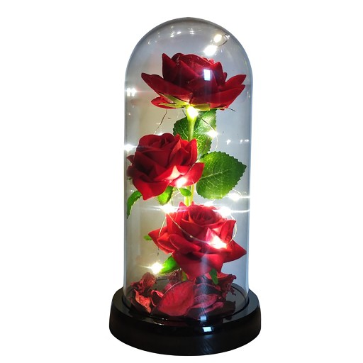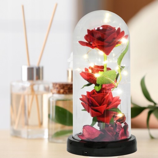 Nasza wieczna róża otoczona jest lampkami LED, które ją pięknie podświetlają. Dzięki temu prezentuje się niezwykle efektownie. Postawiony na nocnym stoliku, komodzie lub stole kwiat wytworzy magiczną atmosferę, która przypomni o Twoich uczuciach.