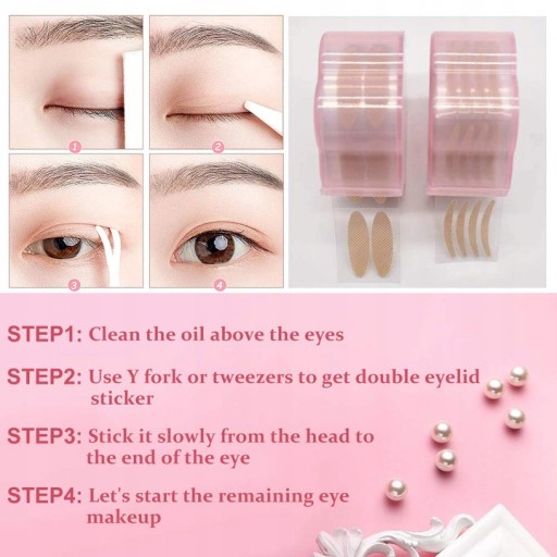 - Przed użyciem upewnij się, że twoja powieka jest czysta, wolna od makijażu, oleju lub środków nawilżających. Ostrożnie usuń uformowane naklejki z podwójną taśmą do powiek za pomocą klipsa.