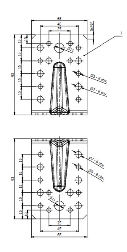 - ilość otworów -16 otworów ø5mm, 12 otworów ø7mm, 2 otwory ø11mm