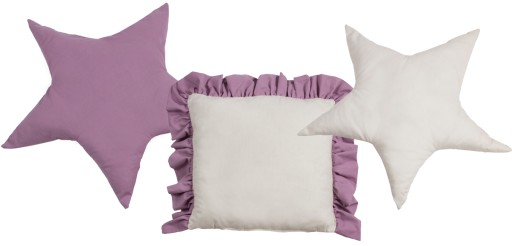 W zestawie 3 poduszeczki: 2 gwiazdki i kwadratowa wykończona falbanką. Poduszki- przytulanki wykonane są z tkaniny bawełnianej. Wypełnienie stanowi mięciutka antyalergiczna kulka sylikonowa. Kolorystycznie pasują do całości zestawu.