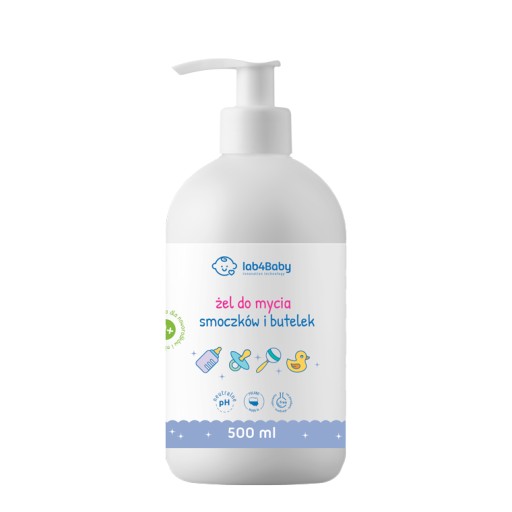 Alg Pharma lab4Baby Żel do mycia smoczków i butelek to produkt w formie płynu żelowego, zapakowany w wygodne opakowanie o pojemności 500 ml. Jest to specjalistyczny środek czyszczący, który został stworzony z myślą o bezpieczeństwie najmłodszych. Żel skutecznie usuwa resztki mleka, soków oraz innych pokarmów z butelek, smoczków, talerzyków i sztućców dla dzieci, nie pozostawiając groźnych dla zdrowia substancji chemicznych.