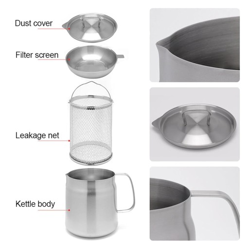 1. RÓWNOMIERNIE WLEWAJ OLEJ: Filtr oleju ma uchwyt, dzięki czemu można go łatwiej podnosić, aby olej kuchenny był czysty i przejrzysty. Wylewka zaparzacza została zaprojektowana tak, aby równomiernie nalewać olej.