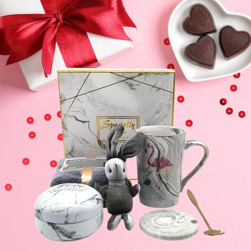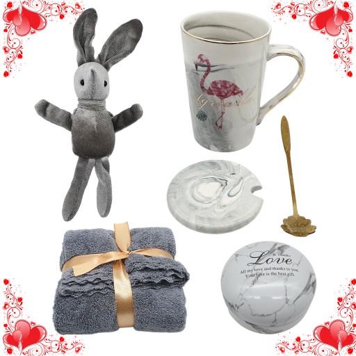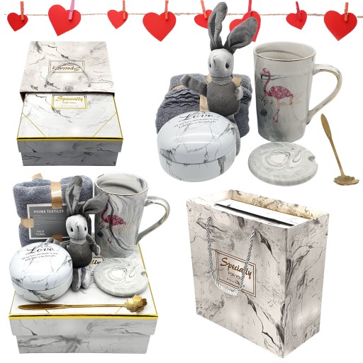 Spraw piękny prezent bliskiej osobie , nasz zestaw to idealny prezent dla NIEJ piękny kubek z złotym zdobieniem oraz namalowanym flamingiem wszystko ręcznie wykonane, aksamitna maskotka w kształcie króliczka miłego w dotyku, ręcznik bardzo delikatny i miękki , pudełeczko na drobiazgi, wszystko pięknie zapakowane w twardy karton z złotym zdobieniem oraz dodatkowo papierowa torebka.