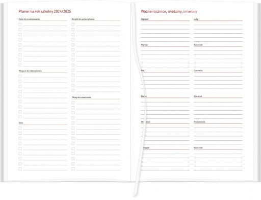 - planer na rok szkolny 2024/2025 (od lipca 2024 do października 2025) - kolejne miesiące roku szkolnego w kolumnach z miejscem na notatki przy każdym dniu