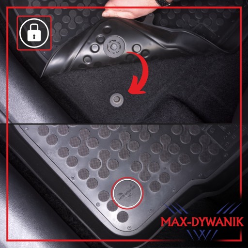 - Dzięki zastosowaniu systemu mocowań w postaci zatrzasków demontaż dywaników jest bardzo wygodny i szybki