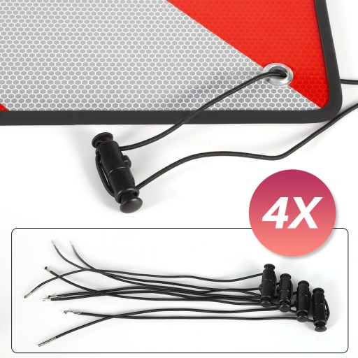 Wymiary deski 50 x 50 cm, solidna aluminiowa płyta o grubości 1 mm z ochronną gumową krawędzią i wypełniona plastikowymi narożnikami, klasa odbicia typu 2, średnica wewnętrzna metalowego oczka 1 cm, z 4 paskami napinającymi bungee 60 cm.
