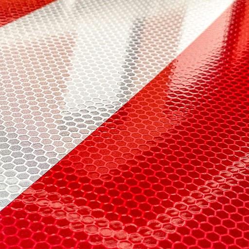 Po obu stronach odblaskowe czerwono-białe paski. Jedna strona z 5 czerwonymi paskami jest odpowiednia dla Włoch, a druga strona z 3 czerwonymi paskami jest przeznaczona dla Hiszpanii.