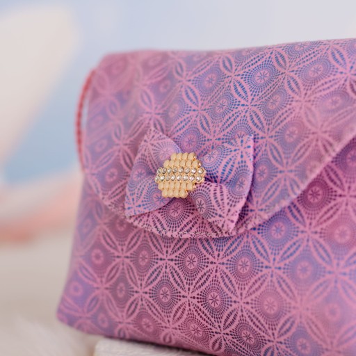 Torebka w kolorze różowym z ciekawym wzorem. Niezbędny element w garderobie małej modnisi. Idealnie sprawdzi się jako dodatek do stylizacji. Na przedniej klapce posiada element ozdobny - kokardkę ze złotą przypinką. Świetnie sprawdzi się zarówno na weselu, komunii jak i przy codziennej stylizacji. Torebka wykonana z wysokiej jakości ekoskórki.