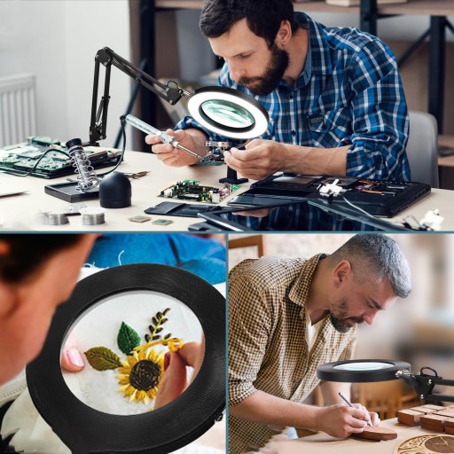 Szklana soczewka może być regulowana w górę i w dół o 270 ° i obracana o 360 °. Teleskopowe długie ramię zapewnia większą elastyczność. Ramię może być przedłużone do 270 cm, z 3 pokrętłami i 4 sprężynami. Regulując pokrętła, można utrzymać światło LED w żądanej pozycji bez łatwego przesuwania, uwalniając w ten sposób obie ręce. Metalowy klips może mocno przymocować lampę lupę, aby zapobiec jej przewróceniu. Nadaje się do biurek, stołów warsztatowych, półek, stołów itp.