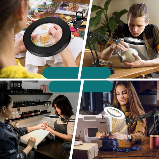 3 tryby oświetlenia: ta lampa LED z lupą ma 64 koraliki LED o wysokiej jasności, 3 temperatury kolorów: ciepłe światło, ciepłe białe światło i białe światło. Każdy tryb oświetlenia ma 10 poziomów ściemniania jasności. Kolor światła lub jasność można łatwo zmienić za pośrednictwem sterownika.