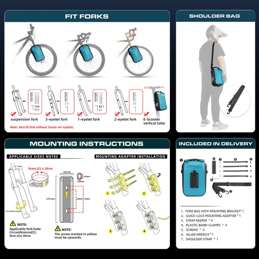 - Ta torba rowerowa może być zamontowana na przednim widelcu roweru, a także może być wygodnym plecakiem dla rowerzystów. Duża pojemność, można łatwo trzymać: pudełko na lunch, klucze, aparat, portfel itp.