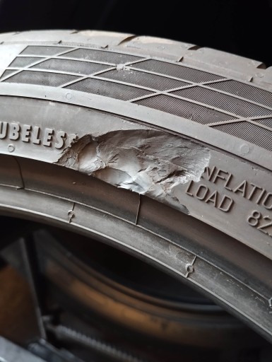 Opona ma płytkie otarcie na rancie ochronnym - wada wyłącznie estetyczna.