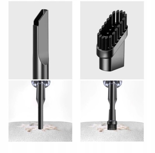 W zestawie oprócz odkurzacza znajdują się 2 wymienne końcówki: - szczotka do czyszczenia wrażliwych na zarysowania elementów i końcówka do trudno dostępnych, ciasnych miejsc.