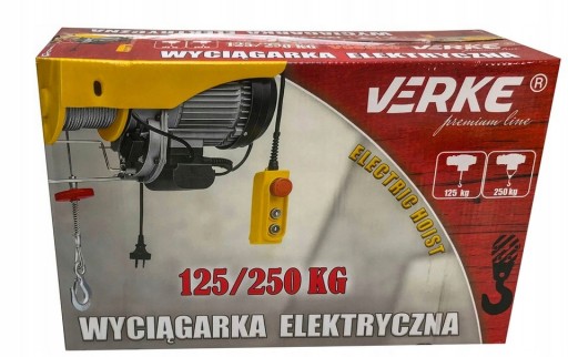 Profesjonalna wyciągarka budowlana linowa Verke Premium Line. Wyciągarka elektryczna jest urządzeniem transportującym ładunki w płaszczyźnie pionowej. Powszechnie wykorzystywana do budowy i remontu domów oraz do pracy w serwisach mechanicznych. Do napędu służy silnik elektryczny zasilany z sieci 230 V. Elementem roboczym jest mocna lina wykonana z drutu stalowego. Urządzenie posiada konsolę sterowniczą umieszczoną na długim przewodzie elektrycznym oraz automatyczny wyłącznik zwijania. Mocny silnik umożliwia szybkie dźwiganie przedmiotów bez nadmiernego wysiłku ze strony obsługującego. Mocny hak łatwo podczepić do ładunku, posiada on zatrzask zabezpieczający. Niezastąpiona przy wciąganiu ciężarów na duże wysokości z zachowaniem maksymalnego bezpieczeństwa.