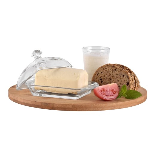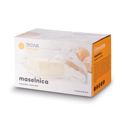Maselniczka szklana Tadar pozwala estetycznie podać na stół masło lub kostkę twarogu. Pokrywka chroni, dlatego na dłużej zachowasz świeżość produktów. Maselnica powstała z trwałego szkła, dlatego długo będzie służyć w Twoim domu.