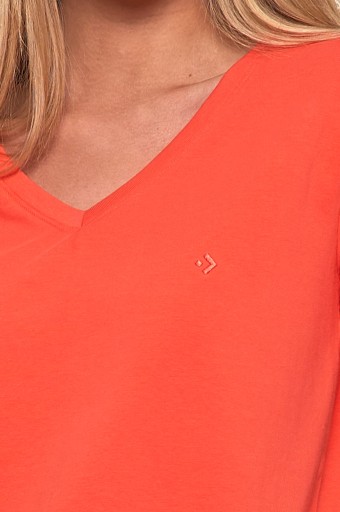 Dekolt w serek delikatnie eksponuje szyję, dodając subtelnej elegancji, podczas gdy prosty fason i linia regular idealnie dopasowują się do każdej sylwetki, zapewniając doskonałe dopasowanie bez ograniczeń. Krótkie rękawy sprawiają, że koszulka jest idealna na ciepłe dni lub jako baza do warstwowych stylizacji.