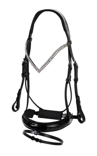Ogłowie wykonane ze skóry bydlęcej. Szeroki nachrapnik jest połączony z dwóch stron regulowanymi paskami. W zestawie wodze parciane ze stoperami. Nachrapnik w typie kombinowanym, regulowany podwójnym paskiem. Część nosowa i część potyliczna podszyte miękką skórą w białym kolorze. Naczółek opada w kształcie litery "V" i ozdobiony jest diamentami.