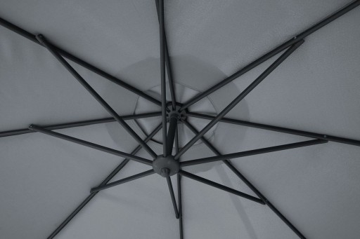 Parasol posiada stalowy słup, drążek do zawieszania oraz ośmiostopniowy system stalowych prętów, co gwarantuje stabilność i trwałość nawet w trudnych warunkach atmosferycznych.